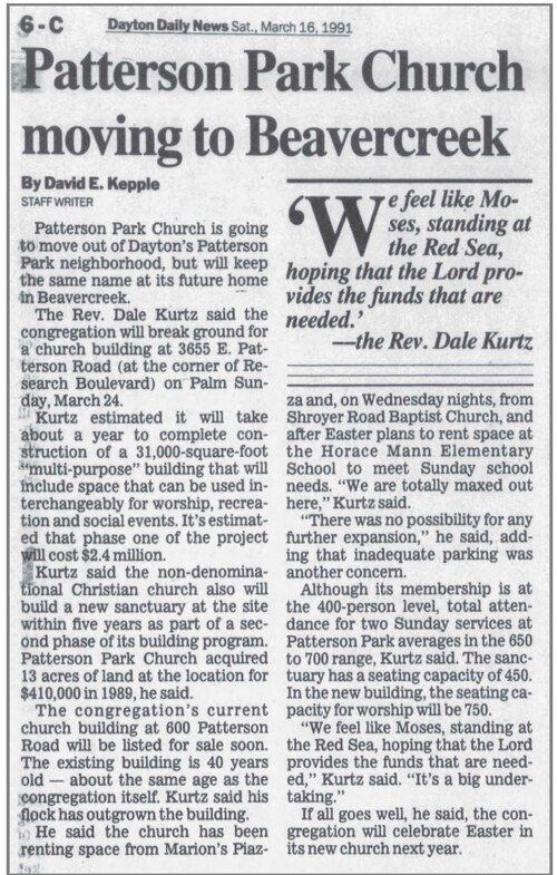 In 1989, the congregation voted to purchase 13 acres of land at 3655 East Patterson Road in Beavercreek. Contracts were signed and the land was purchased debt free in November of 1990.